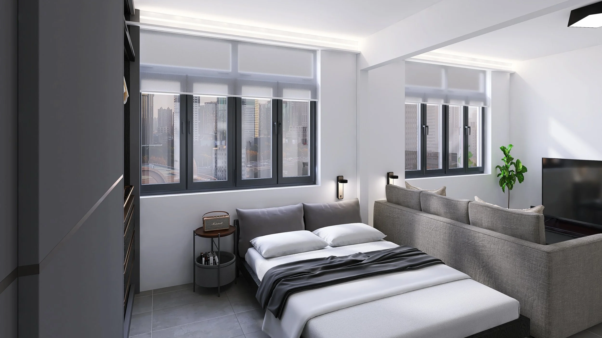 An open-plan studio apartment designed with a modern minimalist approach and monochromatic palette, encompassing the very essence of simplicity and functionality.